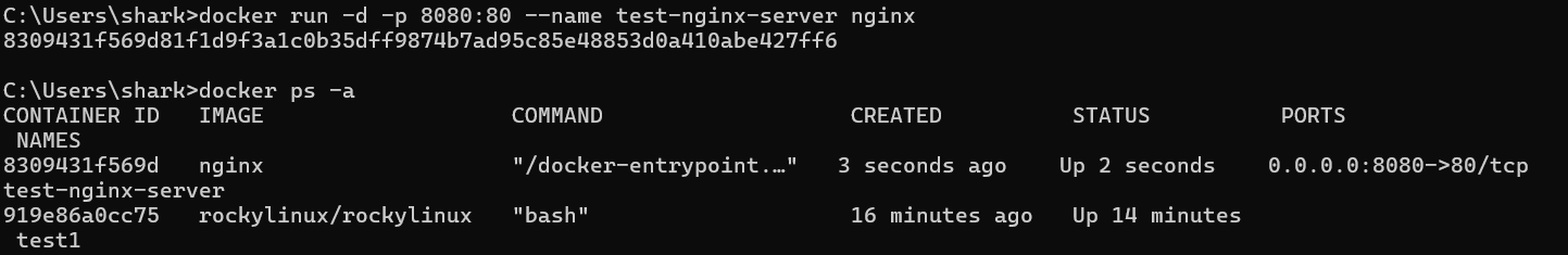 - docker run -d -p 8080:80 --name test-nginx-server nginx 이라고 입력하자.