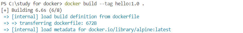 - docker build --tag hello:1.0 이라는 명령어를 넣어준다.
