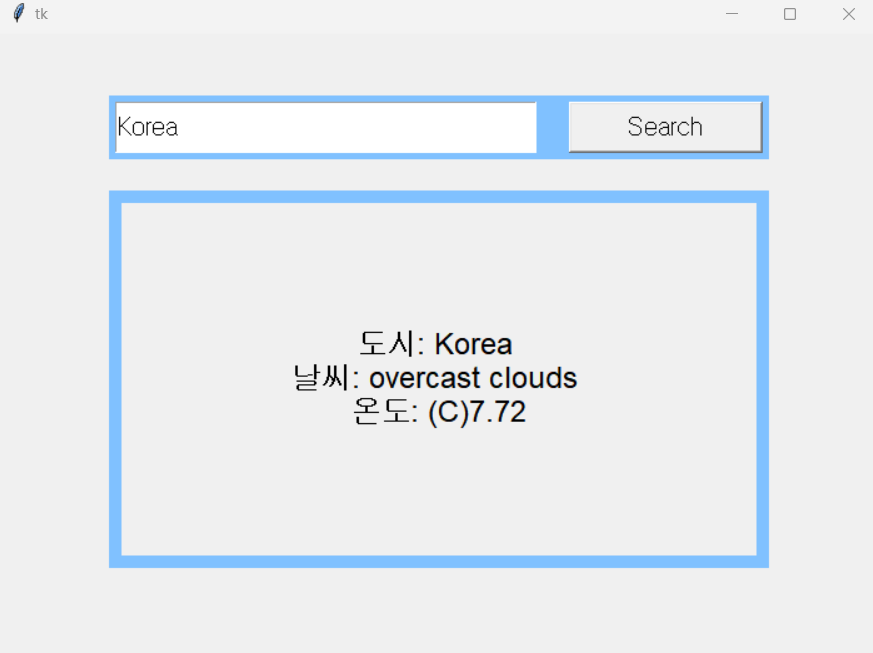 # tk.Button(): 버튼에 텍스트를 넣고 버튼 클릭시에 get_weather()함수를 호출.
